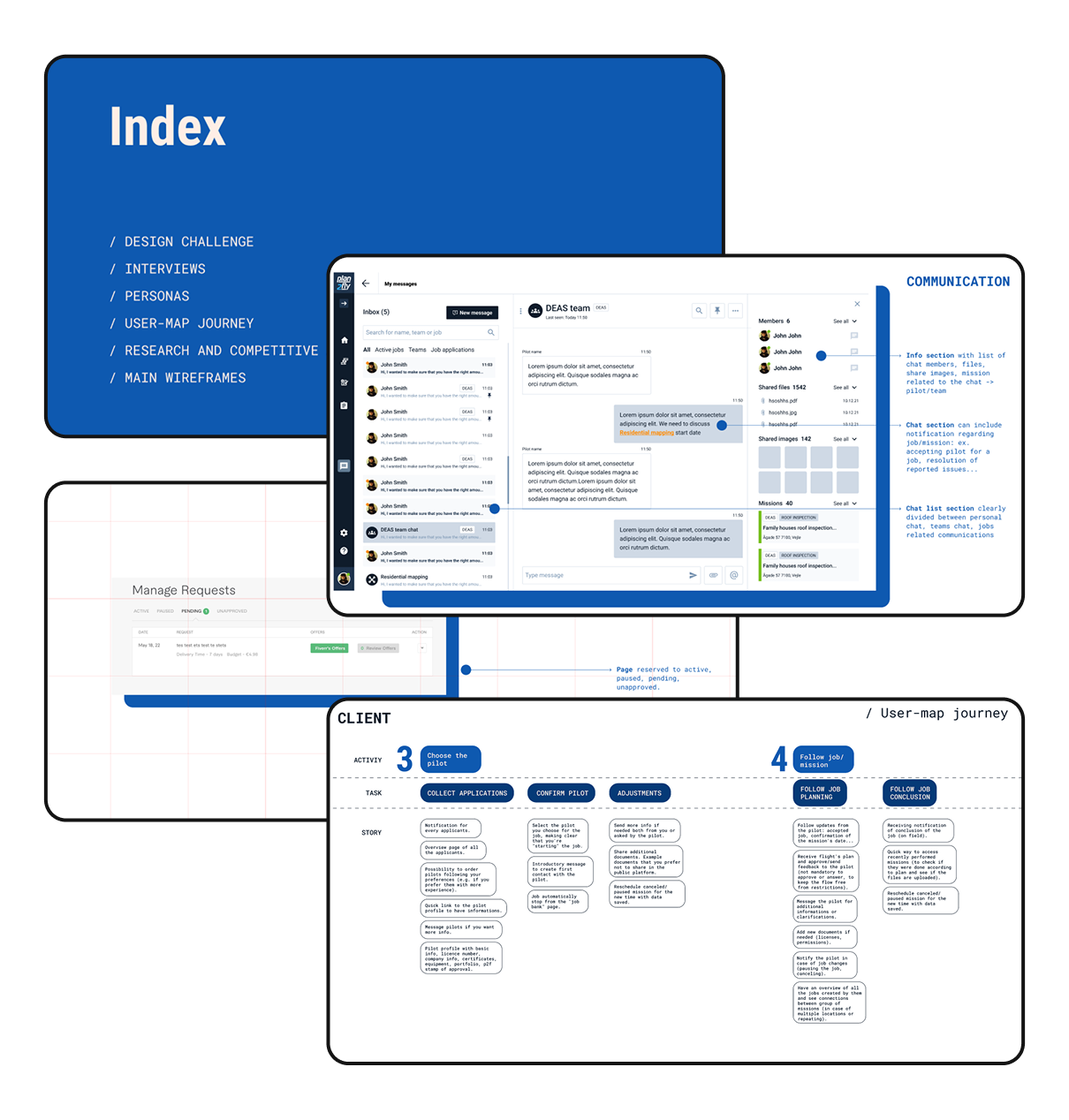 Plan2Fly is a platform connecting drone pilots with clients across industries. At DigiHub, I worked on the client-side experience: researching users, mapping workflows, and designing new flows for job posting, management, and reporting. Building on earlier pilot-side work, we delivered wireframes, component-based flows, and a client dashboard.