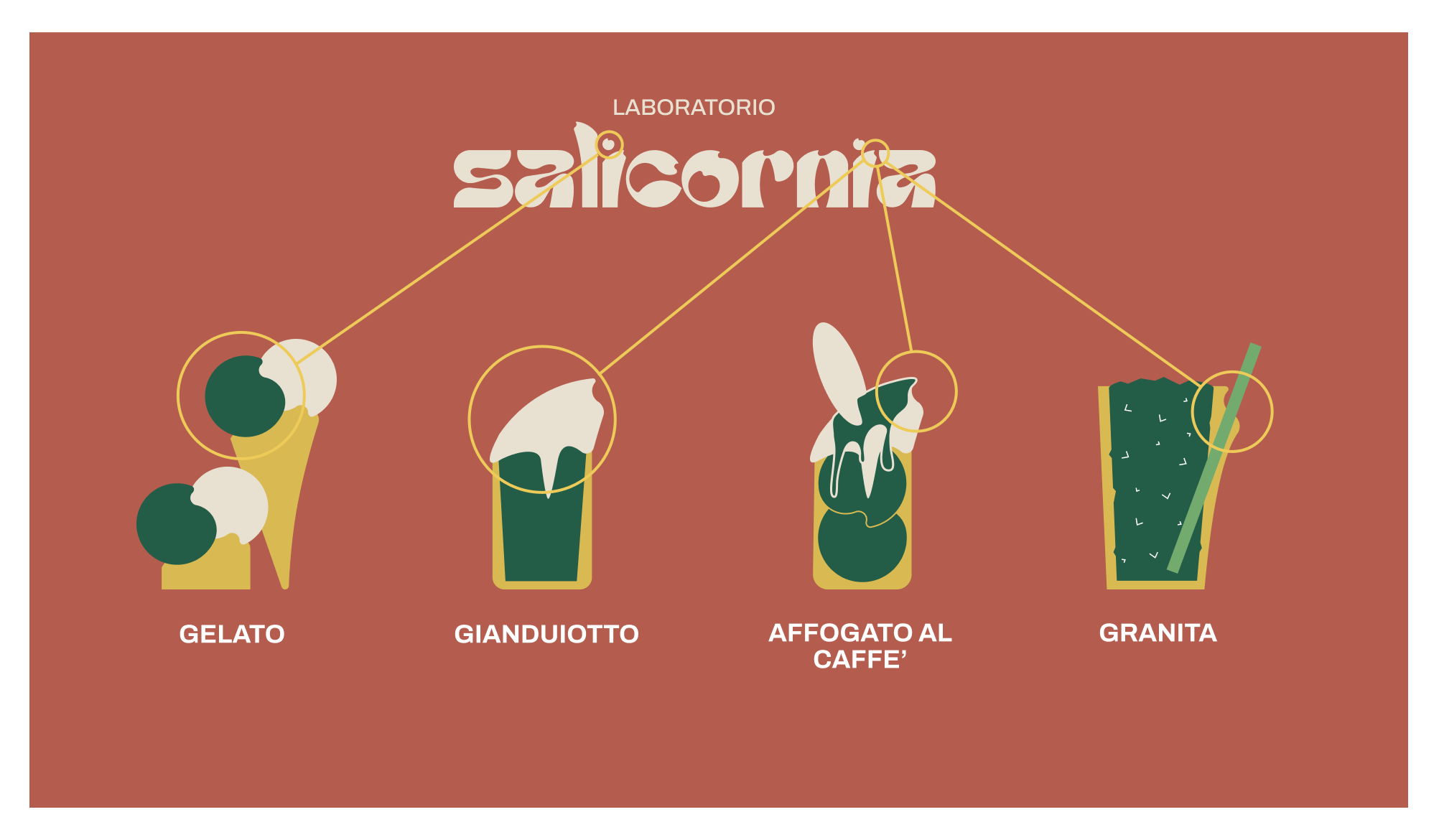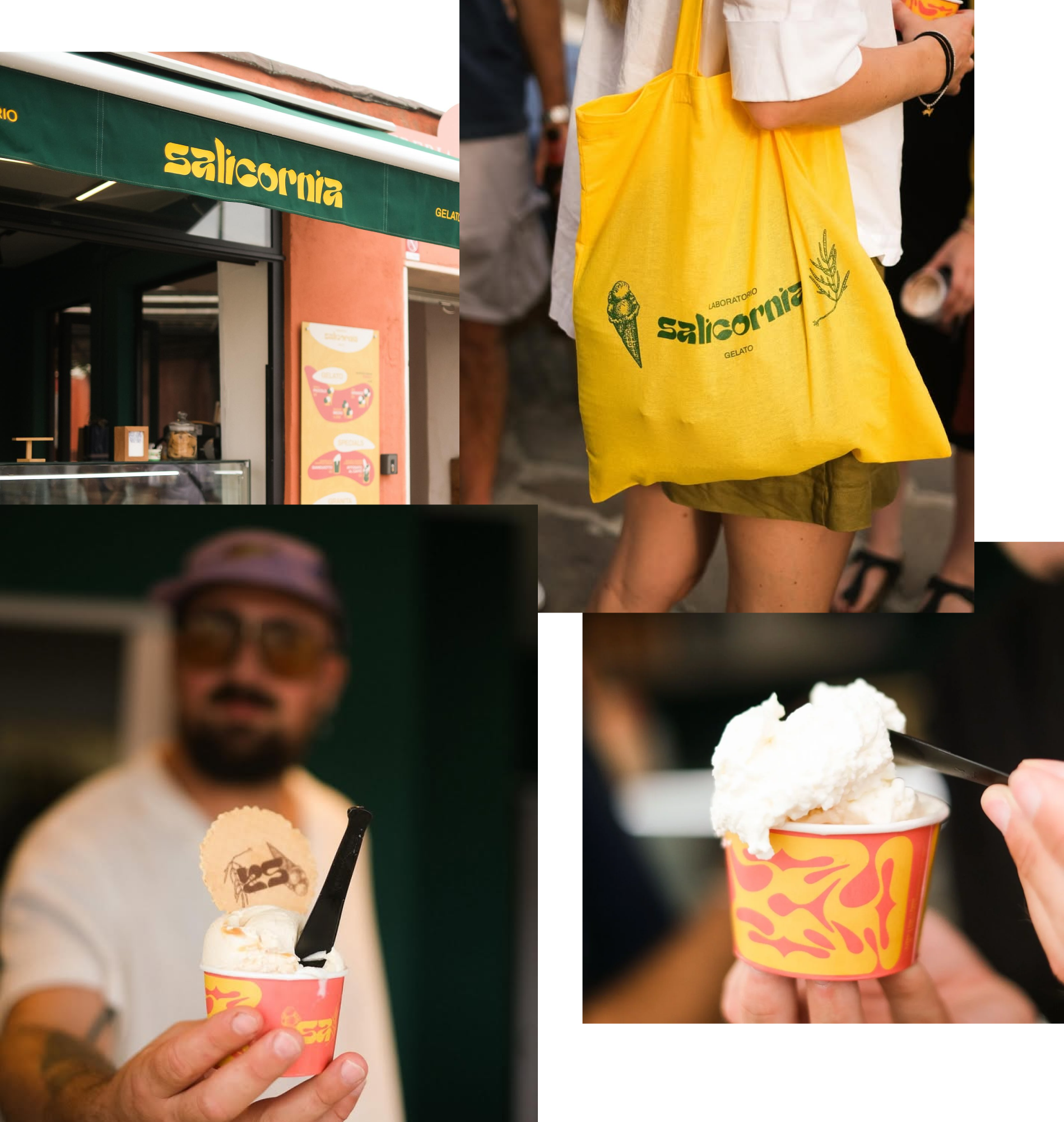 Laboratorio Salicornia is a new artisanal gelateria opened in Murano, Venice, in 2025. The two founders wanted an identity that reflected their values of craftsmanship, quality, and freshness. I guided them through a brand discovery workshop and created the full identity system: logo variations, color palette, typography, pattern, printed applications, and in-store visuals. Illustrations were licensed externally and integrated into the system.